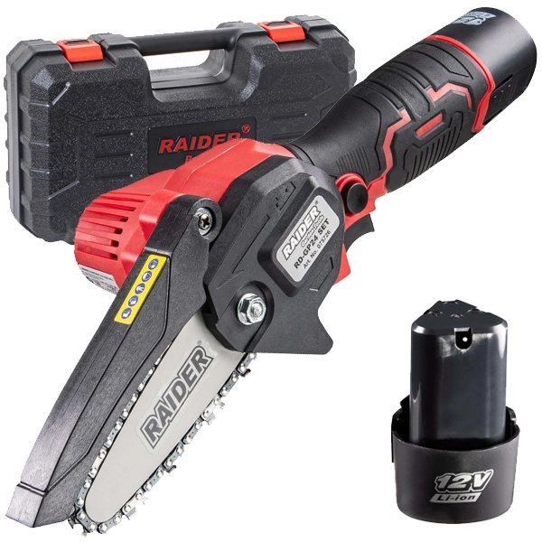 Mini-fierastrau cu lant Raider 2 x baterie Li-Ion, 3800 rpm, lungime lama 10 cm Cu designul său compact, este usor de utilizat fara sa forteze incheietura utilizatorului Protecție pentru a preveni împrăștierea particulelor în timpul funcționării Buton de blocare pentru pornire sigură Are un lanț de tăiere eficient care asigură tăierea rapidă și curata a ramurilor și lemnului 2 x acumulatori Li-Ion asigură o durată lungă de viață și performanță maximă Viteza mare a lanțului, de 5,8 m/s garantează rezultate rapide și tăiere curate Numărul de unități de plumb 28 Grosime pinten (mm) 1.1 Lungime sina de ghidare (cm) 10 Turatie maxima in gol (min-1) 3800 Tensiune nominala (V) 12 Viteza lantului (m/s) 5.8 Tensiune nominal Baterie Pas lant (Inch) 1/4
