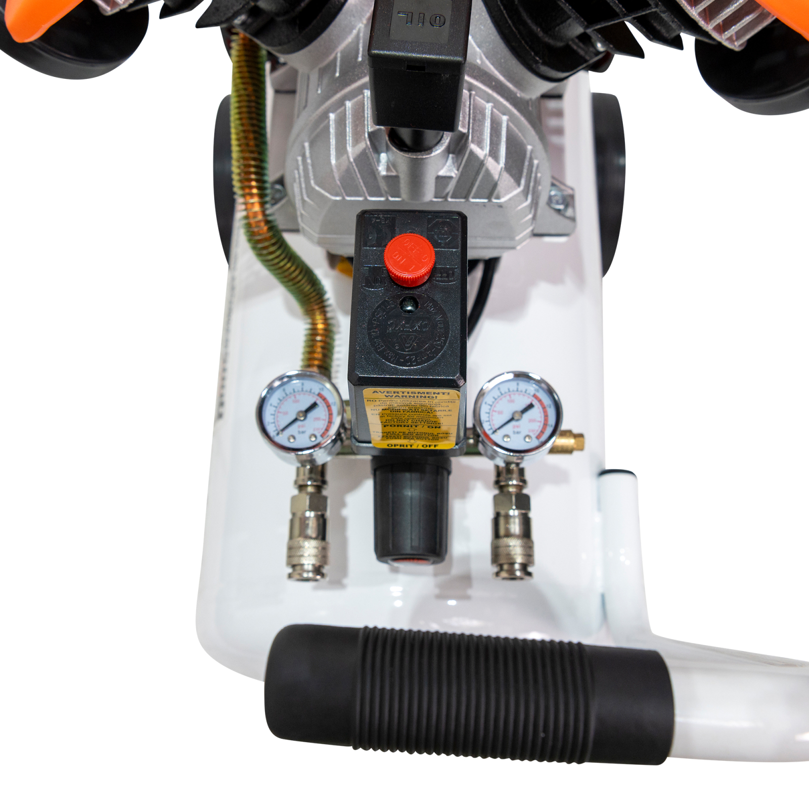 Cele două ieșiri ale compresorului RURIS Double Power 5000, fiecare echipată cu monometru individual, permit utilizarea simultană a două scule pneumatice, cu reglaje independente de presiune. Acest sistem oferă flexibilitate sporită în lucru și economisește timp, fiind ideal pentru sarcini diverse desfășurate în paralel.