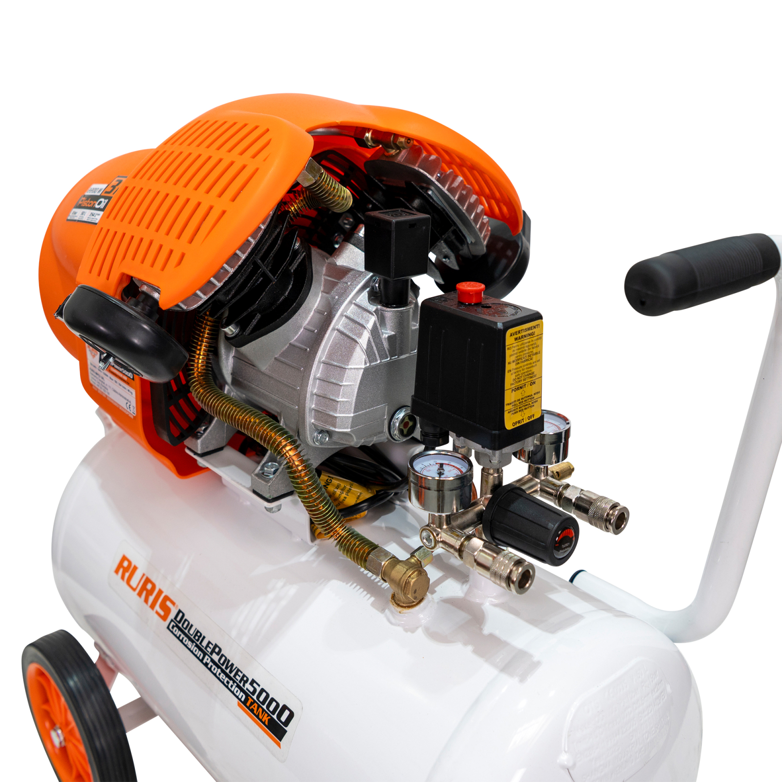 Faptul că motorul compresorului RURIS Double Power 5000 este electric aduce multiple avantaje printre care faptul că utilajul este mai silențios, mai curat și necesită mai puțină întreținere comparativ cu cele pe benzină sau motorină. În plus, alimentarea electrică permite pornirea rapidă și funcționarea continuă în spații închise, fără emisii poluante, ceea ce face ideală utilizarea în ateliere, garaje sau spații industriale unde siguranța și calitatea aerului sunt esențiale.